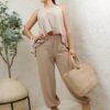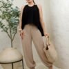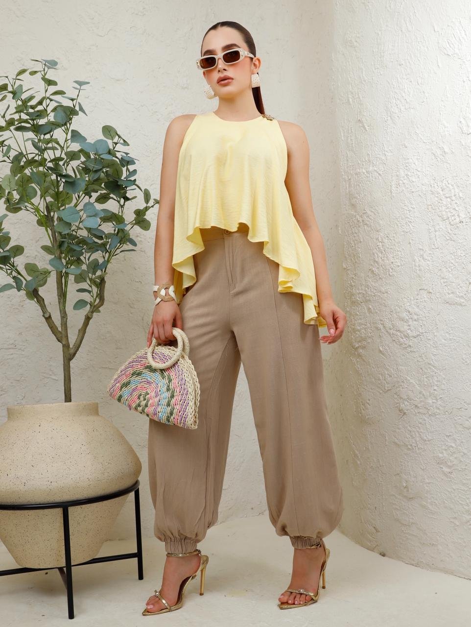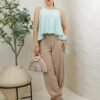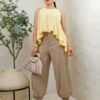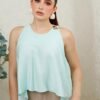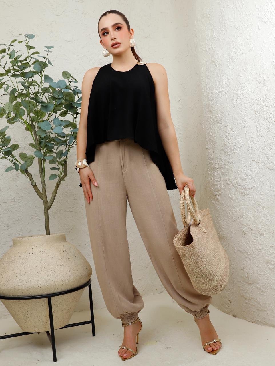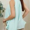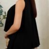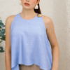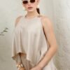 Tela ligera con acabado satinado mate y caída fluida. Diseño amplio de cuello redondo sin mangas, con silueta asimétrica y detalle metálico en el hombro. Su corte suelto aporta movimiento y un estilo elegante y moderno.