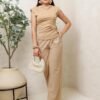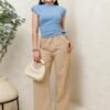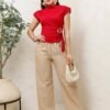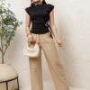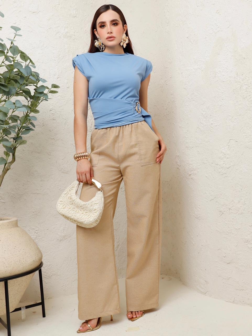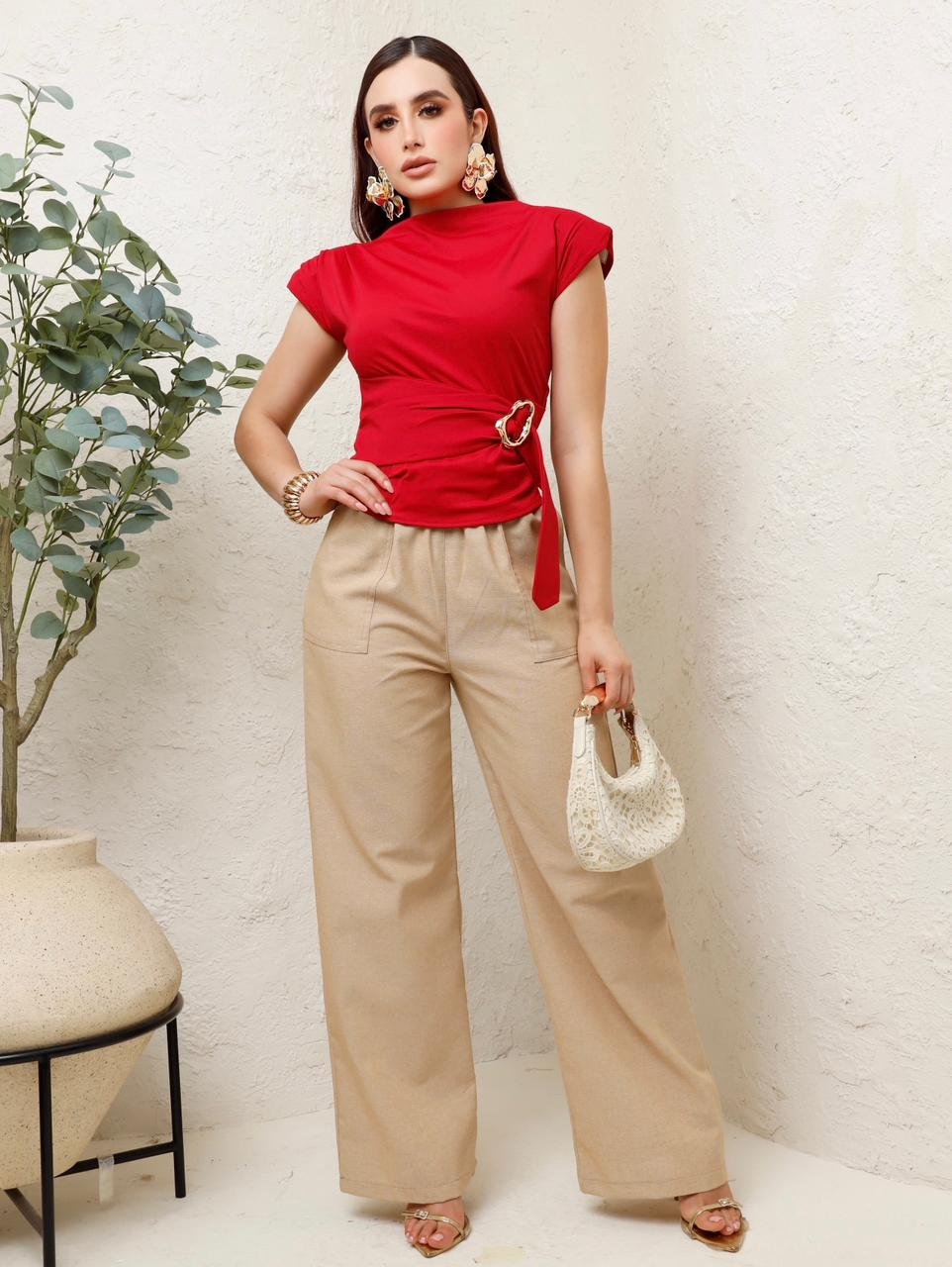 Descripción: Blusa de silueta recta con hombreras estructuradas y cuello alto suave. Cuenta con drapeado lateral que estiliza la cintura y detalle de herraje metálico ajustable que le da un toque moderno y elegante. Su tela Cartagena brinda una caída lisa y cómoda, ideal para combinar con pantalones, faldas o looks más sofisticados.