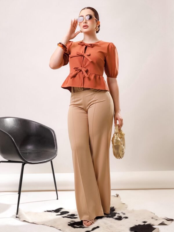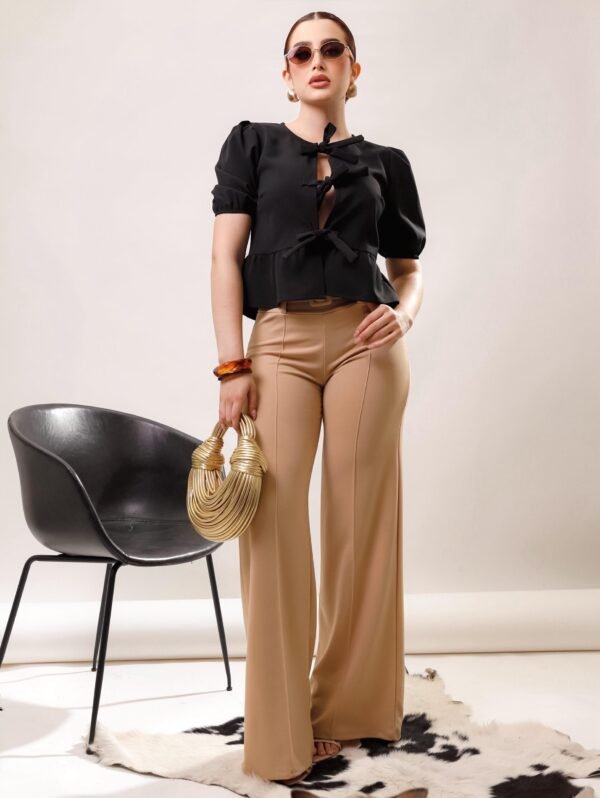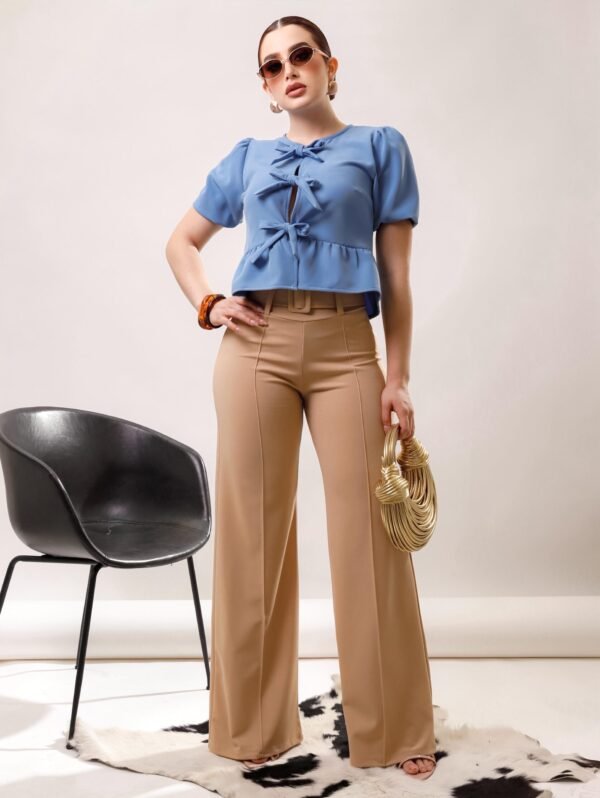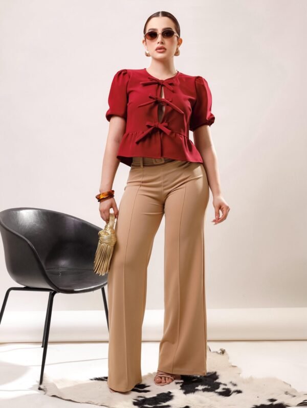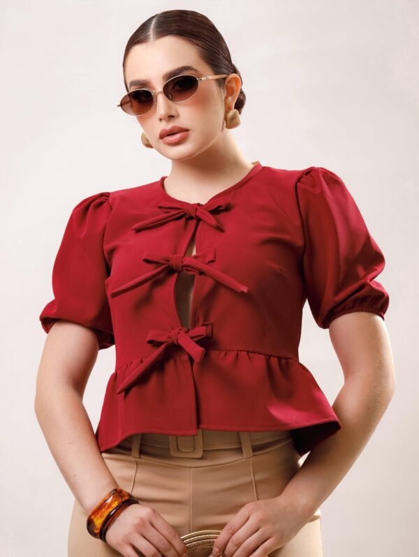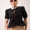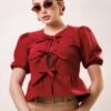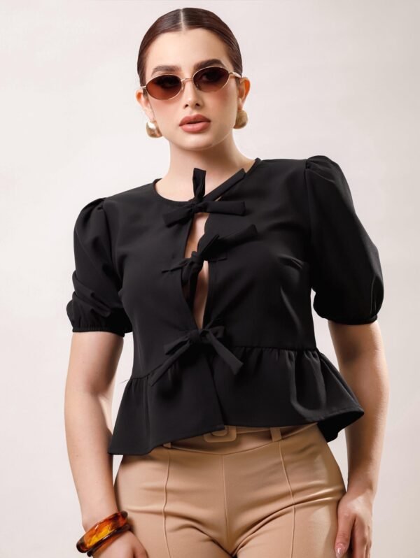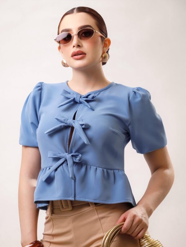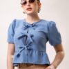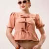 Blusa manga aglobada lazos moño COMPOSICIÓN: Barbie 100% POLIESTER 95% ELASTANO 5%