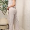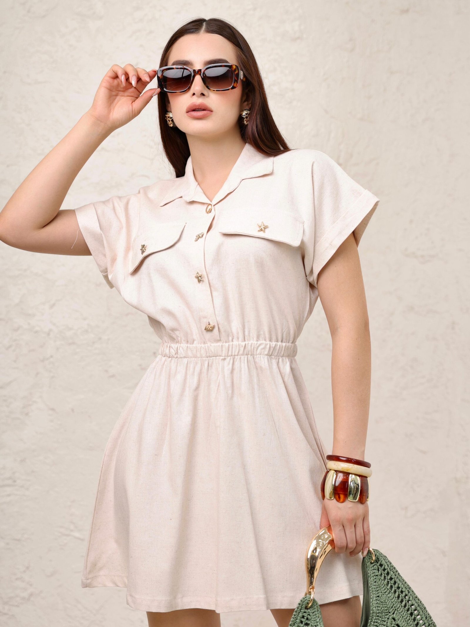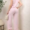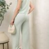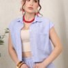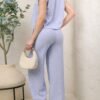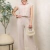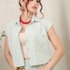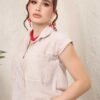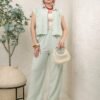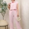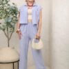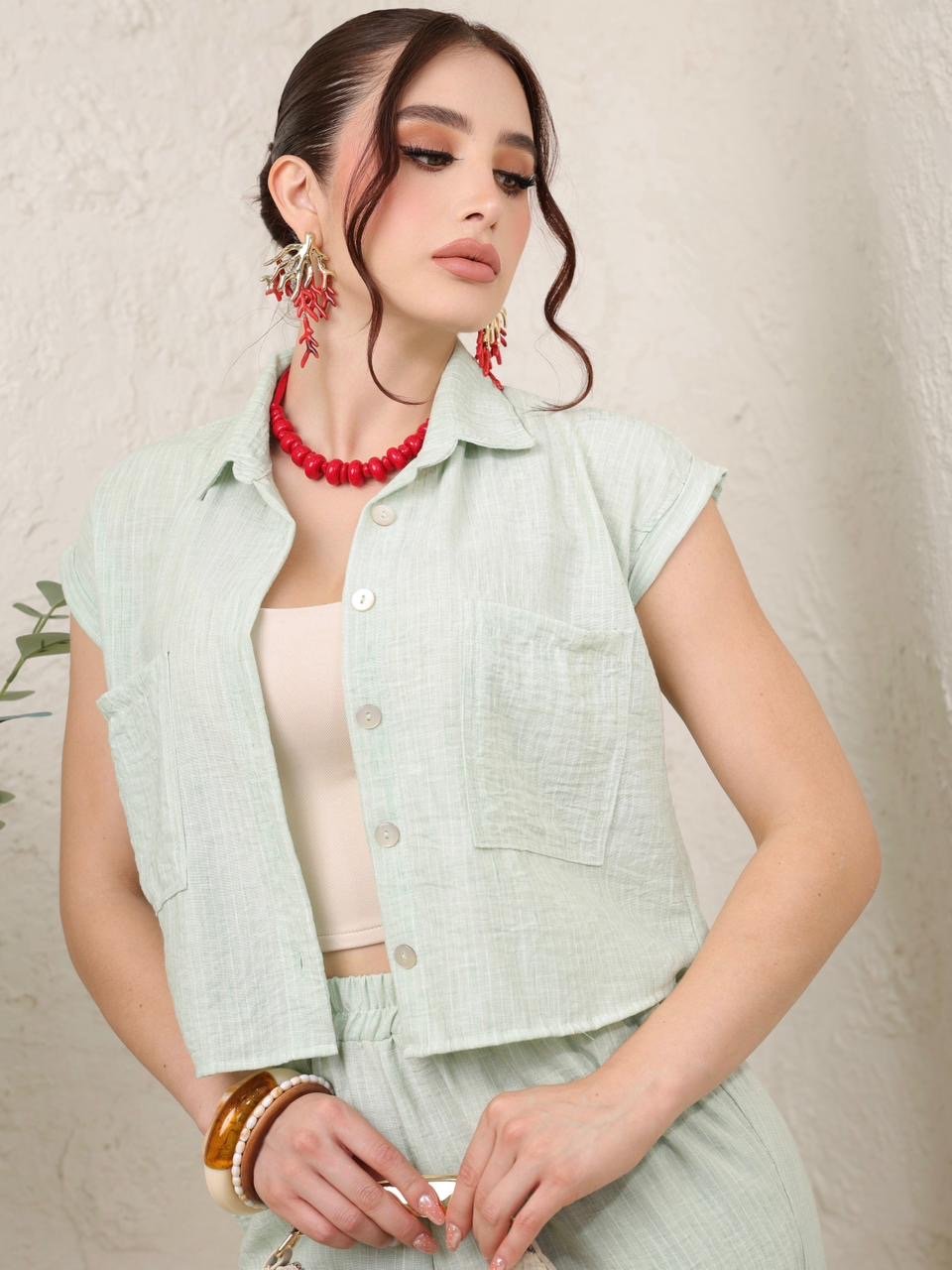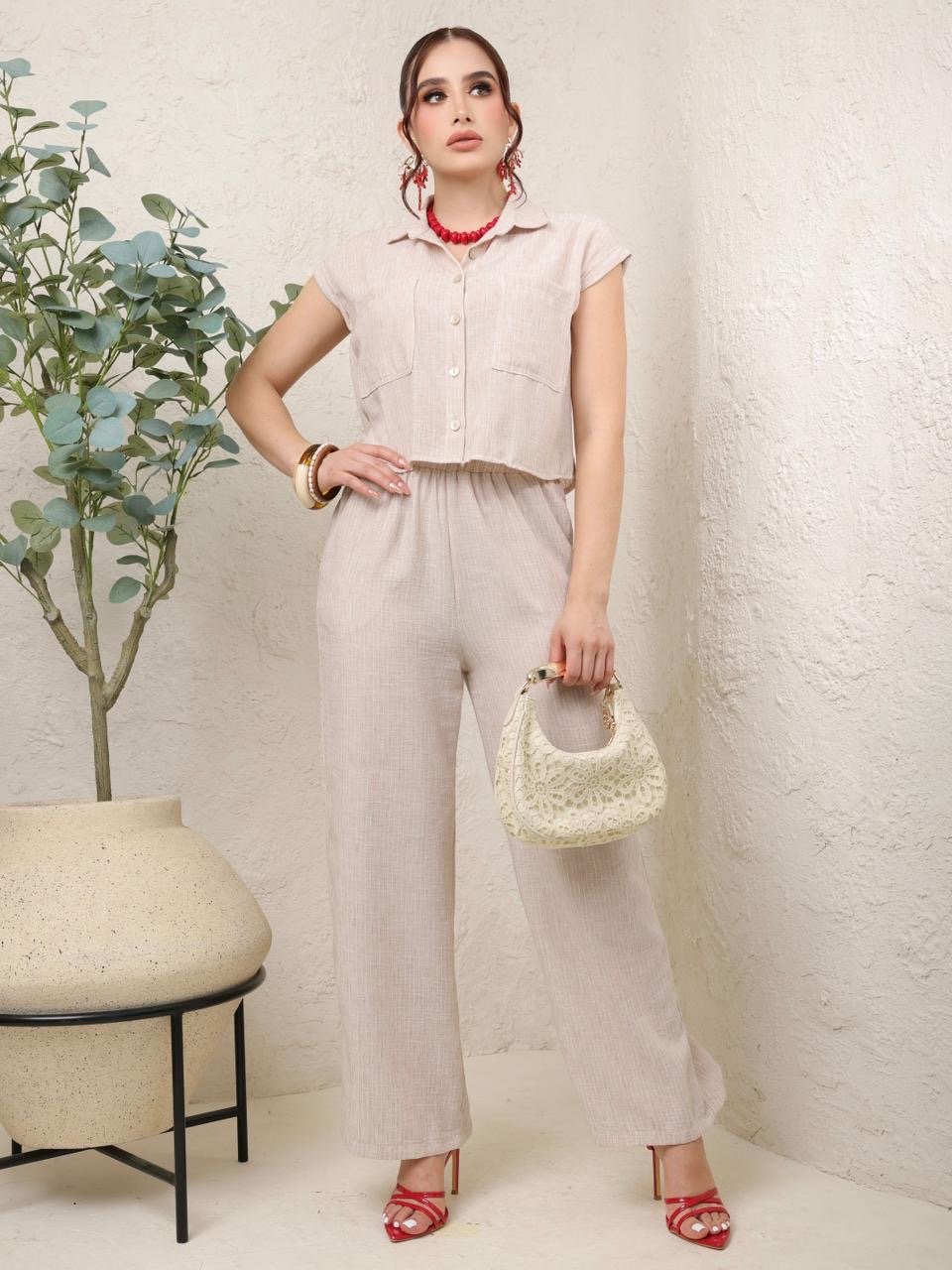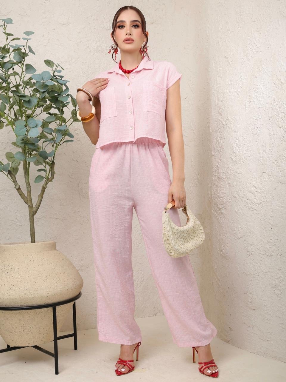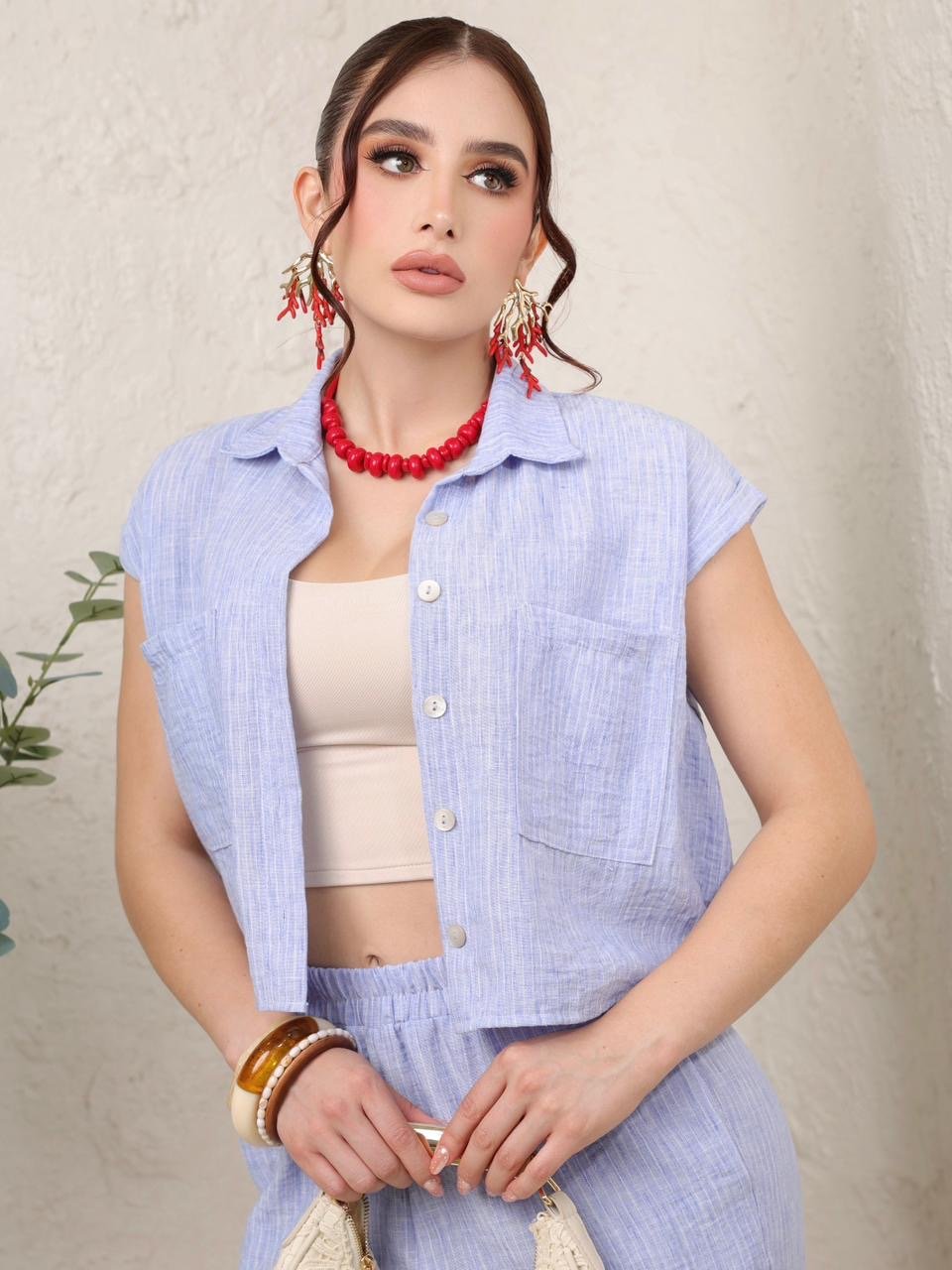 Descripción: Set de dos piezas compuesto por camisa crop de manga corta con cuello, botonadura frontal y bolsas decorativas, acompañado de pantalón de pierna recta con cintura elástica para mayor comodidad. Su tela de lino con textura de rayas le da un acabado fresco y relajado, ideal para looks casuales con un toque sofisticado.