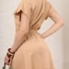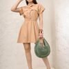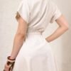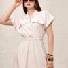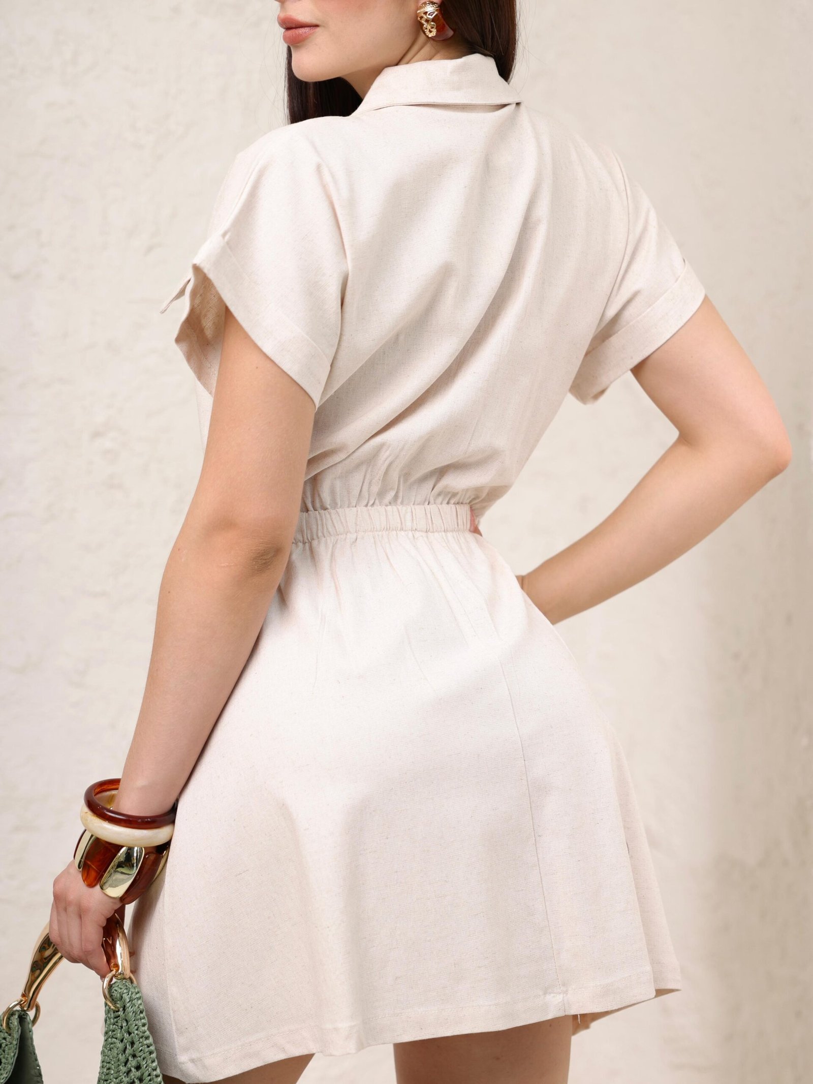 Descripción: Vestido corto tipo camisero con manga doblada, bolsillos decorativos al frente y cintura con resorte que estiliza la silueta. Destaca por sus botones inspirados en elementos marinos y su falda con ligero vuelo que aporta frescura y movimiento. El lino le da una textura ligera y cómoda, ideal para looks casuales y sofisticados.