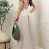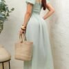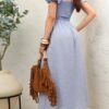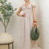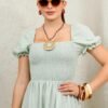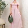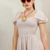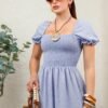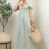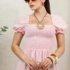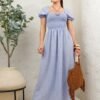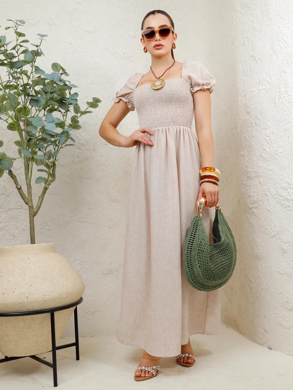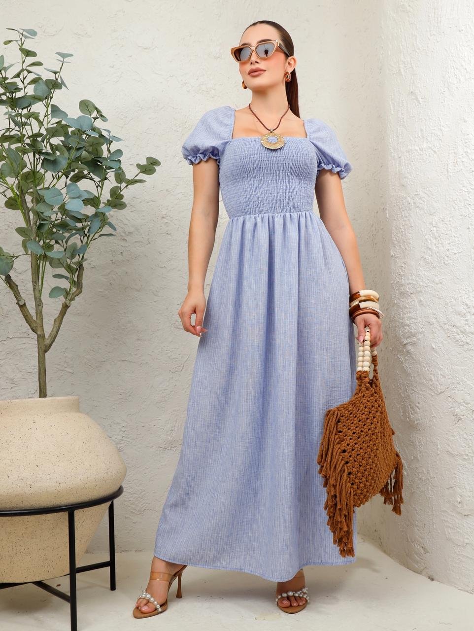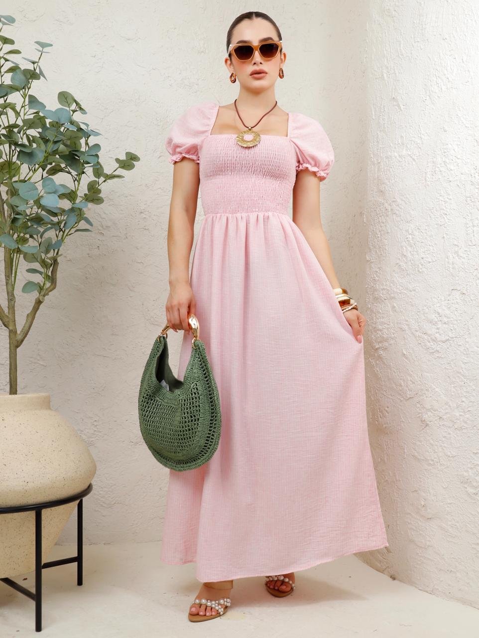Vestido largo confeccionado en tela ligera con textura suave y caída fluida. Diseño de escote cuadrado con cuerpo fruncido tipo smock que se ajusta cómodamente a la silueta. Manga corta abullonada con resorte y falda amplia de movimiento ligero. Ideal para un look femenino y romántico.