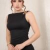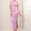 Descripción: Vestido midi de silueta ajustada con escote alto y detalle de herraje metálico en el hombro. Cuenta con drapeado lateral que estiliza la figura y abertura frontal que aporta movimiento y un toque elegante. Su tela brush brinda suavidad, comodidad y un ajuste favorecedor ideal para eventos, cenas o looks más sofisticados.