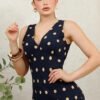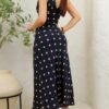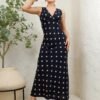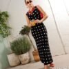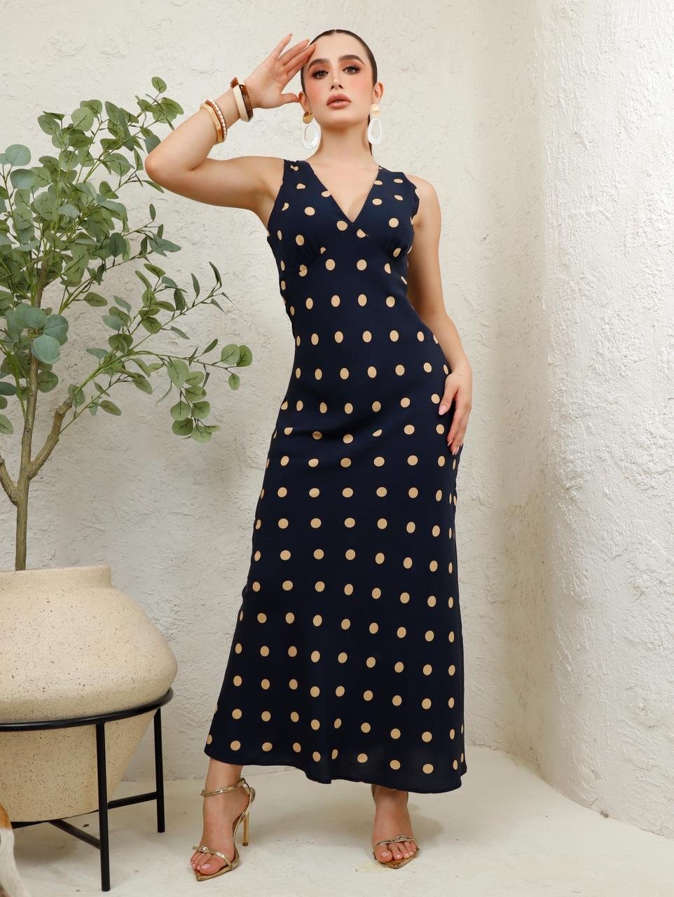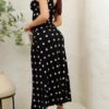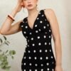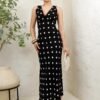 Tela ligera con elasticidad, suave al tacto y de caída fluida. Diseño largo sin mangas con escote en V cruzado y estampado de lunares blancos sobre fondo negro. Silueta entallada que estiliza la figura con un aire clásico y elegante.