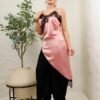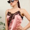 Tela satinada ligera con acabado brillante y tacto suave. Diseño midi de tirantes finos con corte asimétrico, aplicaciones de encaje floral negro y caída fluida. Su silueta lencera aporta un estilo elegante, femenino y sofisticado.