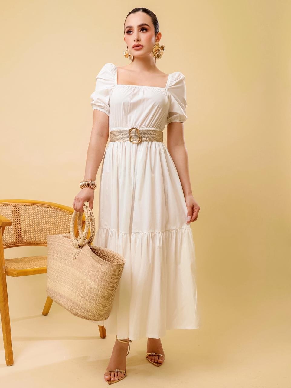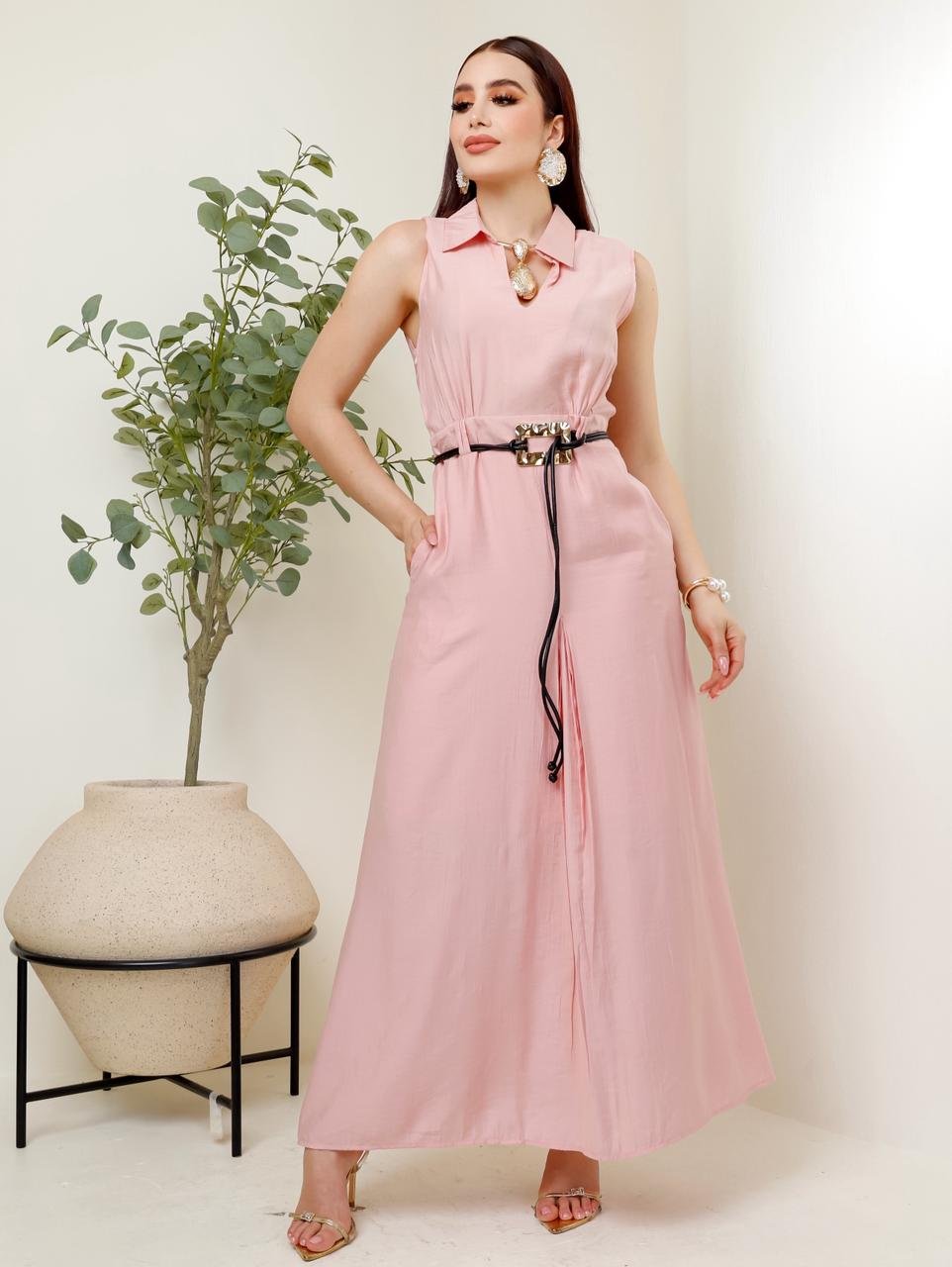 Vestido Maxi Camisero con Cinturón cuadrado Dorado